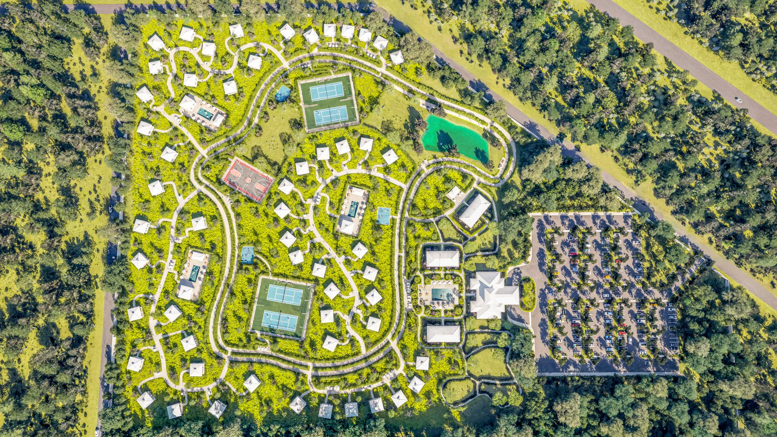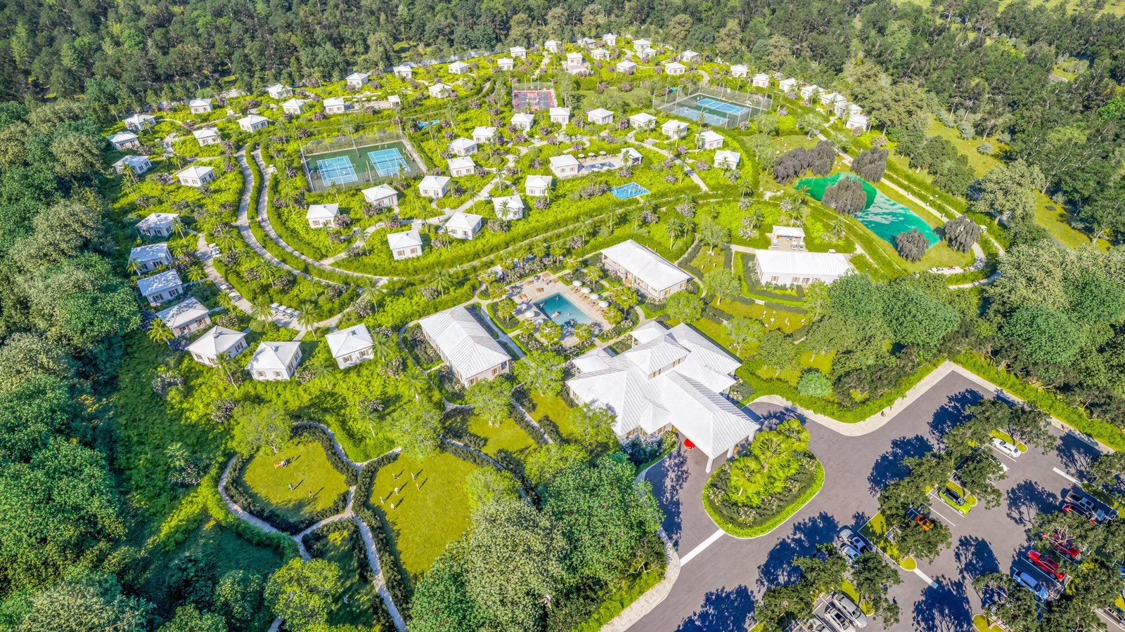 Our resort includes exclusive "tiny home" residential clusters, designed for those who prioritize a walkable, high-performance lifestyle. These sustainable, modern dwellings are centered around a private community hub featuring a resort-style pool and professional-grade grilling stations, all connected by a network of scenic, pedestrian-friendly paths.