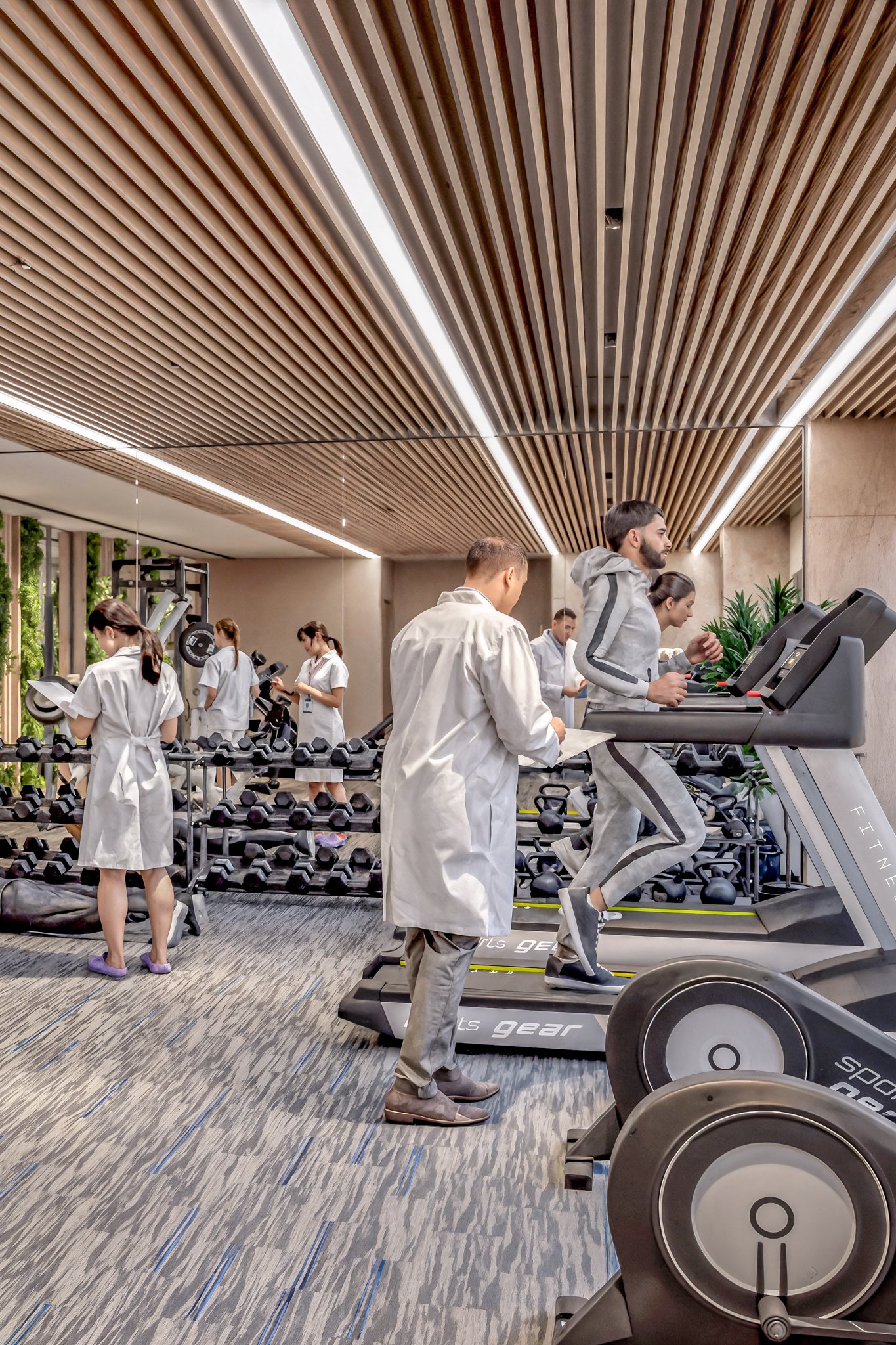 Designed for privacy and precision, our professional wing houses quiet, sound-proofed offices for specialized medical consultations and manual therapy. These dedicated spaces allow our doctors and sports therapists to conduct thorough evaluations and one-on-one treatments in a focused, clinical environment before you move to the active floor.