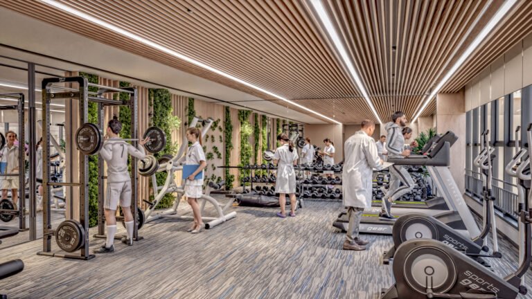 The Palazzo Sports training floor is an expansive, high-volume environment where championship-caliber gym facilities meet the cutting edge of sports technology. Defined by soaring ceilings and a refined industrial aesthetic, this area is meticulously engineered for total human optimization—from heavy-load strength and conditioning to high-tech biomechanical analysis. Integrated directly into the athletic floor are specialized tech rooms housing the latest in recovery and performance science, including cryotherapy, infrared saunas, and diagnostic labs.